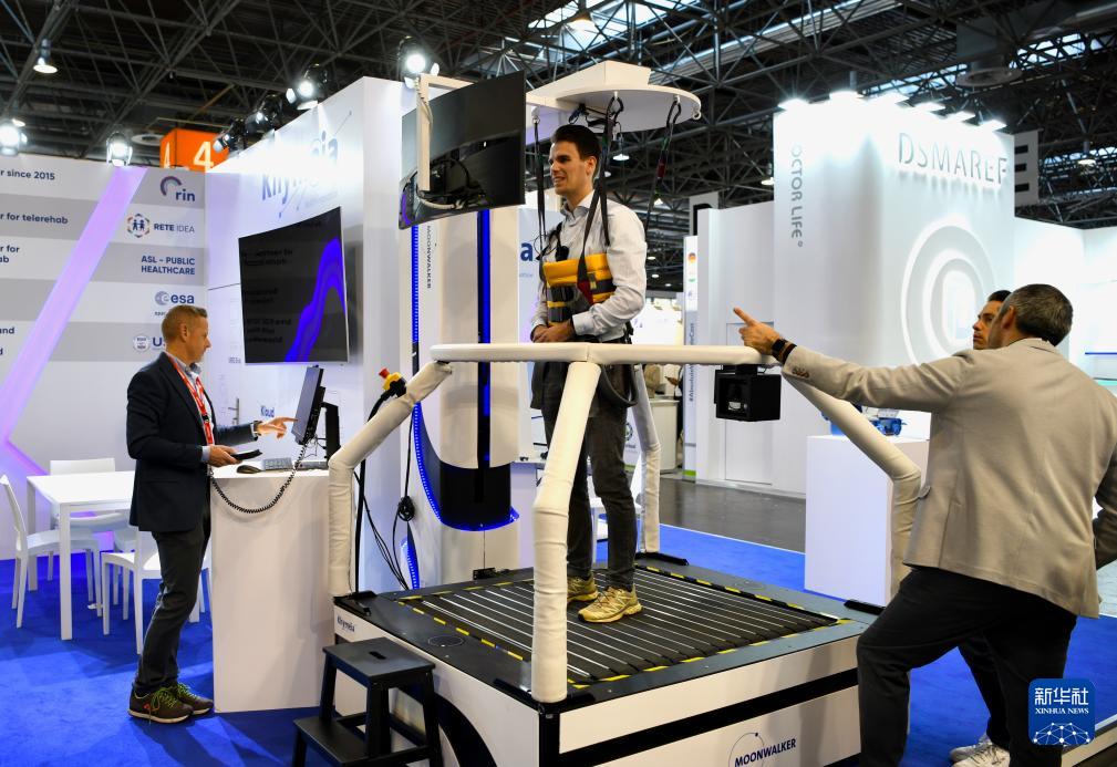 11月17日,一名參觀者在德國杜塞爾多夫國際醫療器械設備展上體驗康復設備。