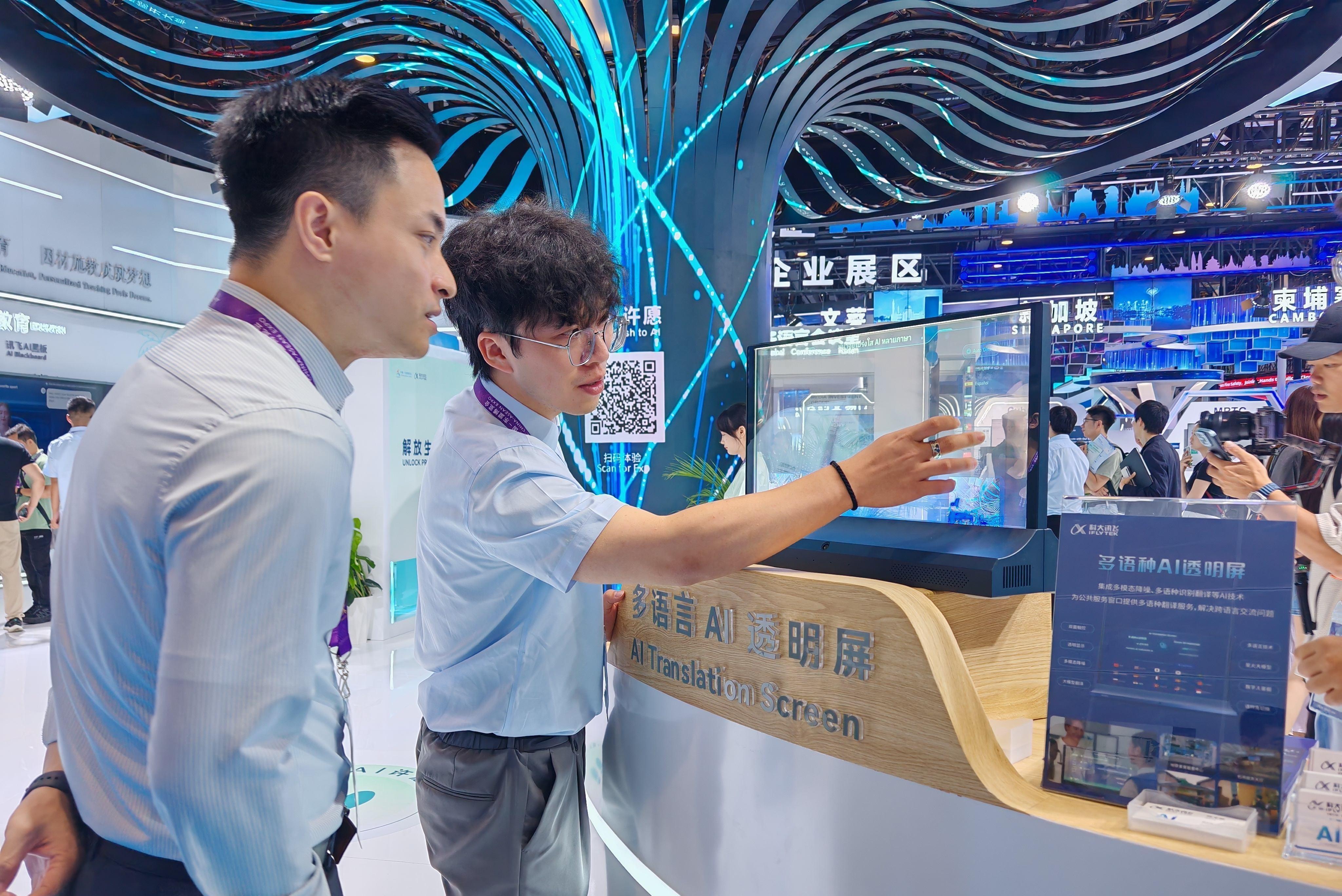科大訊飛股份有限公司透明屏項目經理王春浩介紹,這款設備集成了多語種語音識別翻譯、多模態降噪等技術。在多模態降噪技術支持下,即便在展館這類人員密集、環境嘈雜的場所,多語言AI透明屏也能夠精準捕捉用戶語音信息并完成翻譯。同時,這款產品采用透光率達92%的雙面OLED透明屏。這種高透明度屏幕支持雙面顯示與雙面觸控,兩側使用者互不干擾。