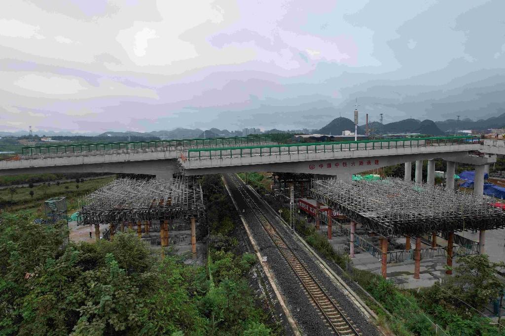 普定特大橋地處貴州省安順市普定縣工業(yè)園區(qū),全長(zhǎng)1535.5米,跨越多條城市干道,是安盤高速全線核心控制節(jié)點(diǎn)。其中涉鐵段長(zhǎng)120米,上跨西南地區(qū)“能源動(dòng)脈”黃織鐵路,橋梁與鐵路交角85度;單幅橋面長(zhǎng)80米、寬18.15米,轉(zhuǎn)體總重量達(dá)16000噸,施工需攻克配重控制難、液壓驅(qū)動(dòng)穩(wěn)定性要求高、合龍精度嚴(yán)等多重挑戰(zhàn)。