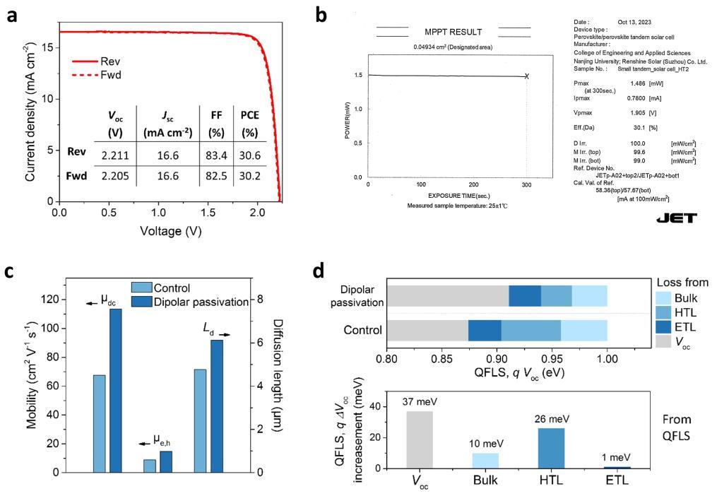 此次研究中科研人員發現,鈣鈦礦吸光層和空穴傳輸層之間的界面,是載流子損耗較多的區域。團隊為此設計出一種偶極鈍化層,它就像城市里的單行道,一頭連著鈣鈦礦吸光層,一頭連著空穴傳輸層,驅使載流子向空穴傳輸層運動。
