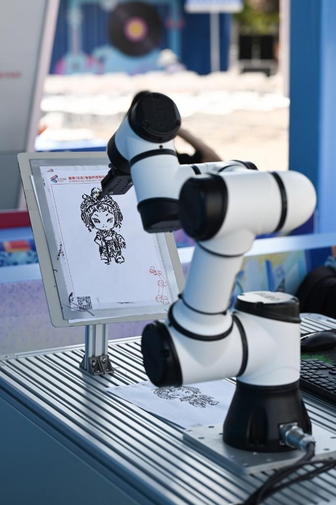 本屆戲曲周特設(shè)“戲韻智界”專區(qū),通過機(jī)器人、VR/MR、AI等前沿技術(shù)打破傳統(tǒng)觀演邊界。月季園內(nèi),“孫悟空”“牛魔王”高動態(tài)機(jī)甲與游客互動表演,逼真造型與靈活動作引發(fā)陣陣歡呼;銀杏大道上的AI復(fù)古報(bào)紙機(jī),3秒即可生成印有個(gè)人形象的戲曲主題報(bào)紙,成為游客打卡熱門;身著戲服的機(jī)器狗“哮天犬”則憑借萌趣模樣,成為孩子們的最愛。此外,活動還聯(lián)合QQ音樂、酷狗等平臺推出“國粹典藏”名段專輯,收錄15位梅花獎得主在內(nèi)的30位名家共88首經(jīng)典唱段,供公眾免費(fèi)收聽,讓戲曲之聲借助數(shù)字平臺觸達(dá)更廣泛的人群。