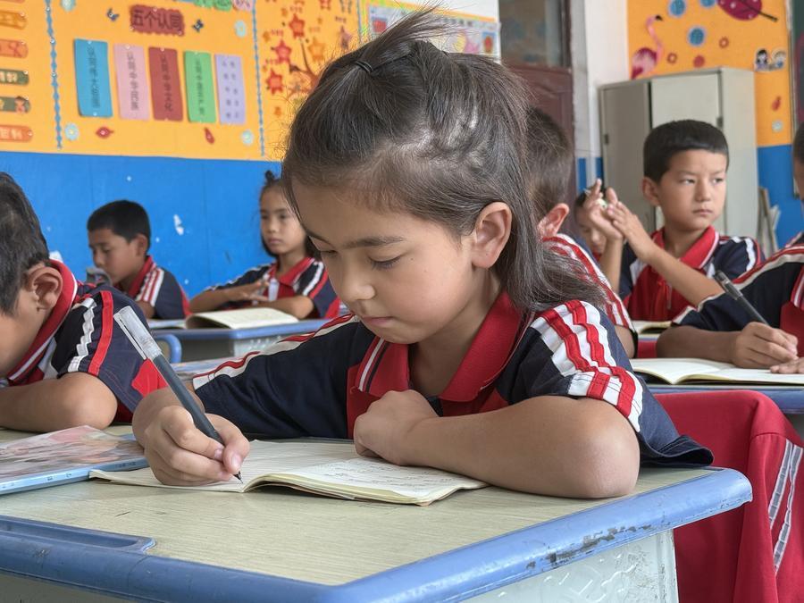 9月17日,鄯善縣達朗坎鄉(xiāng)中心學校三年級四班學生乃則熱與同學們上數(shù)學課。(受訪者供圖)