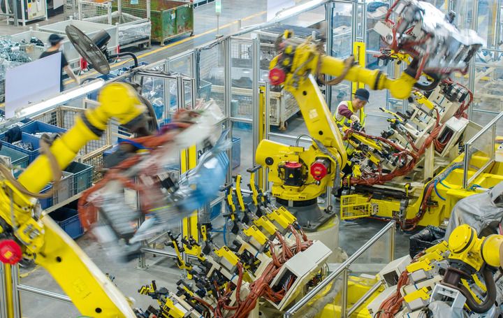 2025年10月9日,浙江省湖州市長(zhǎng)興經(jīng)濟(jì)技術(shù)開(kāi)發(fā)區(qū)一家汽車部件有限公司的技術(shù)人員操控工業(yè)機(jī)器人生產(chǎn)新能源汽車配件(無(wú)人機(jī)照片)。新華社發(fā)(譚云俸攝)