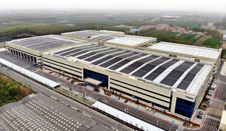 2025年4月17日拍攝的位于山東青島膠州市的海爾AI賦能多聯機互聯工廠(無人機照片)。新華社記者 李紫恒 攝