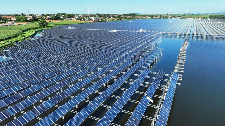 2025年7月30日在遼寧省鐵嶺市鐵嶺縣大青水庫拍攝的光伏發電板(無人機照片)。新華社記者 楊青 攝