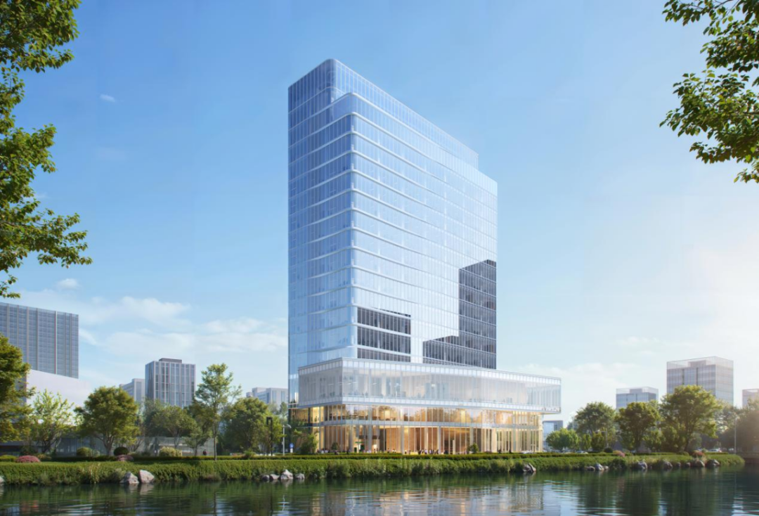 該項目主體塔樓沿江南大道橫向延展,通體采用簡約現代的玻璃幕墻與精密金屬構架,形成富有科技感和未來感的城市形象界面。裙房沿場地向南側拓展,巧妙借景永久河自然風光,內部設置試驗平臺、企業展廳等功能空間,進一步增強大樓休閑氛圍與社交活力。