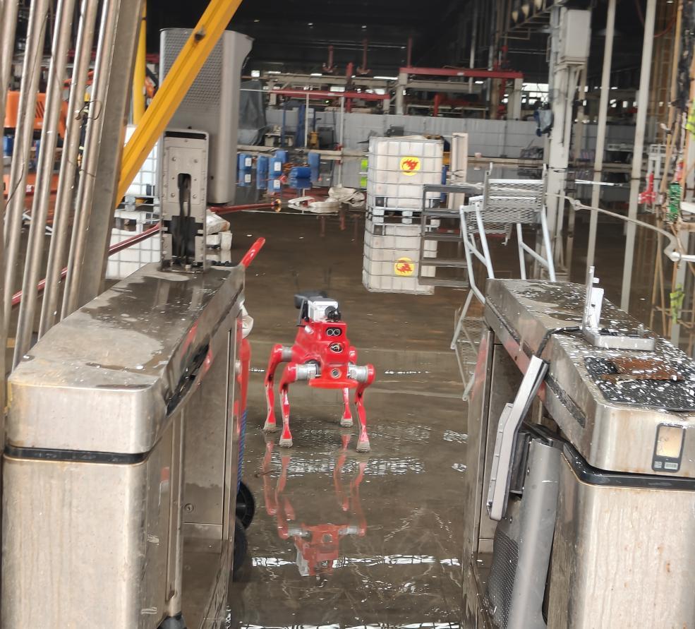 在大跨度大空間廠房滅火救援實戰演練現場,火災初期偵察階段,多模態消防機器狗可以迅速部署到火災現場,利用其攜帶的各種傳感器進行全方位的偵察,將現場的圖像、視頻實時回傳至指揮中心。