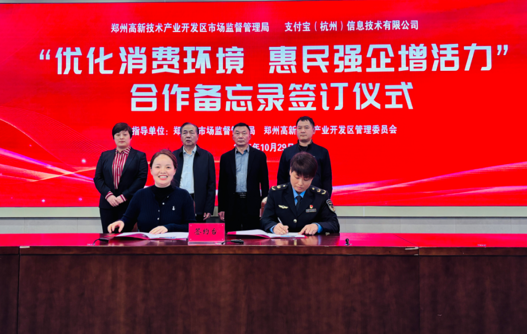 10月29日下午,在鄭州市市場監管局與鄭州高新區管委會聯合指導下,鄭州高新區市場監督管理局與支付寶(杭州)信息技術有限公司正式簽署“優化消費環境 惠民強企增活力”合作備忘錄,并同步啟動“放心消費在中原”宣傳活動。雙方共同打造的“線下消費云端和解”新模式在河南省尚屬首創,標志著鄭州在運用數字技術優化消費環境、提升消費維權效能方面邁出關鍵一步。