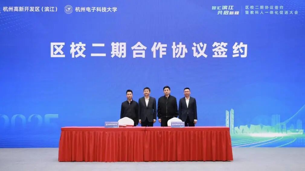 11月5日下午,“智匯濱江 共啟新程”杭州高新區(濱江)與杭州電子科技大學區校二期協議簽約暨教科人一體化促進大會舉行。杭州市濱江區委書記鄭迪,杭州電子科技大學黨委書記王堯祥出席并致辭。杭州高新區領導王理生,杭州電子科技大學領導顏成鋼、李攀出席。